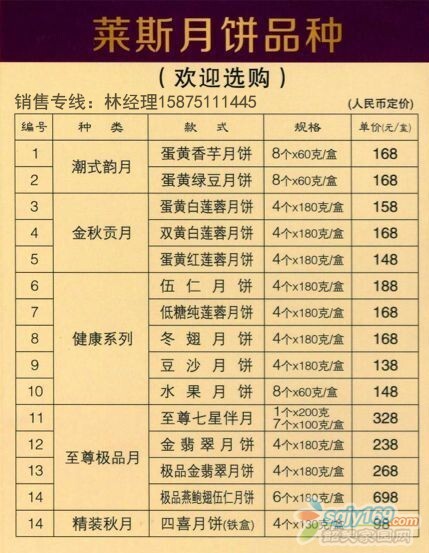 正文摘要:優(yōu)惠品種數(shù)量有限,售完即止 歡迎廣大朋友訂購,林小姐:15875111445(歡迎朋友們加微信好友了解更多萊斯月餅祥情) QQ:413778007(空間有相關(guān)價目表及品種介紹) 提前購買,折扣更低 |