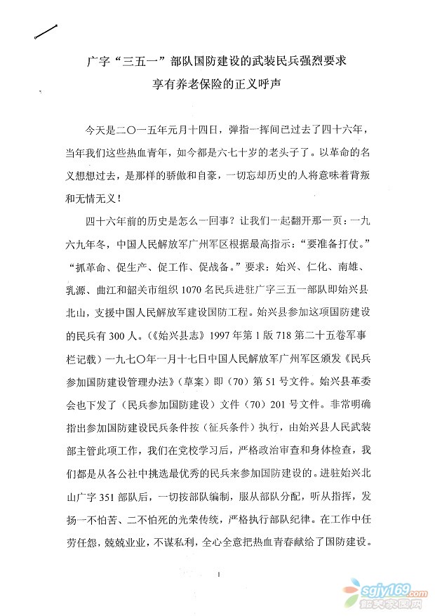 廣字"351"部隊國防建設(shè)的武裝民兵強烈要求享有養(yǎng)老保險的呼聲