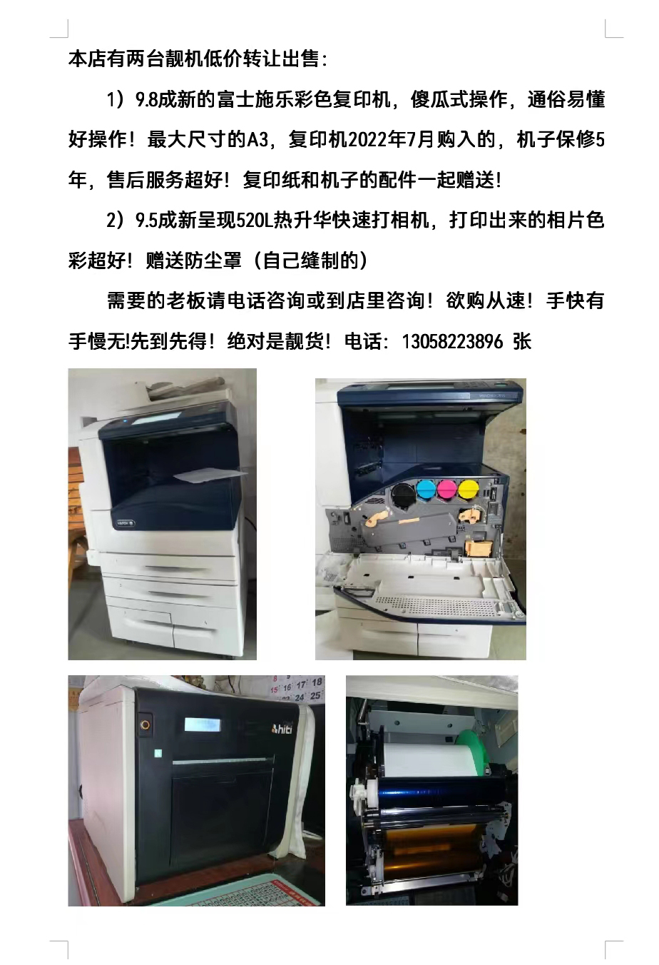 1)9.8成新的富士施樂(lè)彩色復(fù)印機(jī),傻瓜式操作,通俗易懂好操作!最大尺寸的A3,復(fù)印機(jī)2022年7月購(gòu)入的,機(jī)子保修5年,售后服務(wù)超好!復(fù)印紙和機(jī)子的配件一起贈(zèng)送! 2)9.5成新呈現(xiàn)520L熱升華快速打相機(jī),打印出來(lái)的相片色彩超好!贈(zèng)送防塵罩(自己縫制的) 更多信息